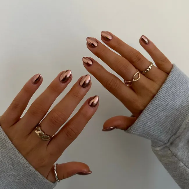 Sleek, shiny, and stunning—these rose gold chrome nails give major luxe energy. They shimmer with every movement, adding a glamorous touch to your fall fits.