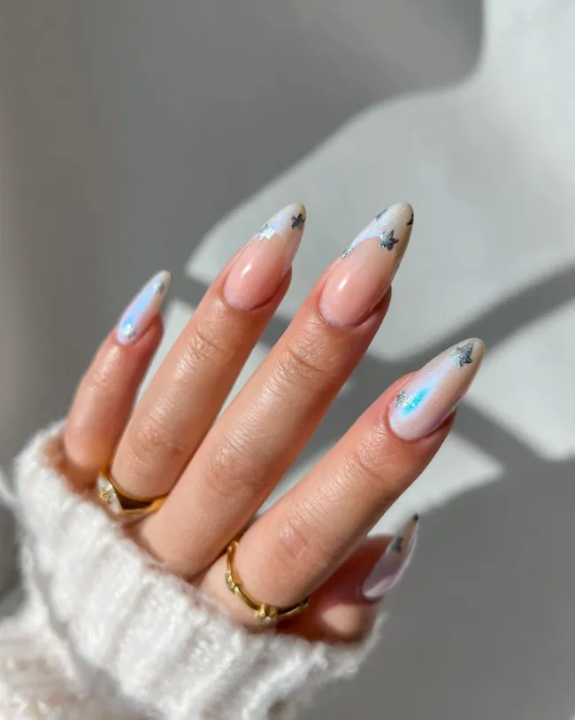 Delicate and dreamy, this nail set is all about quiet sparkle. White abstract tips meet tiny silver star accents for a mani that feels like a cool evening sky.