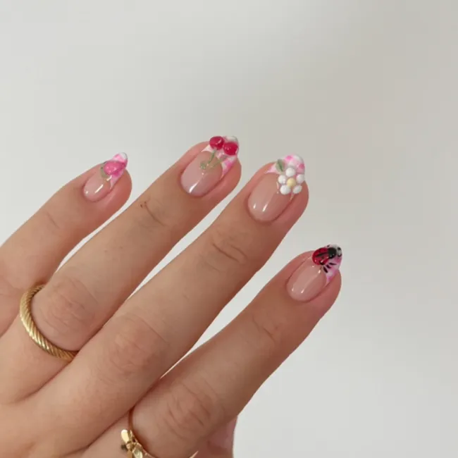 Sweet and charming, these classic French tips get a playful September update with dainty florals and tiny ladybug accents.