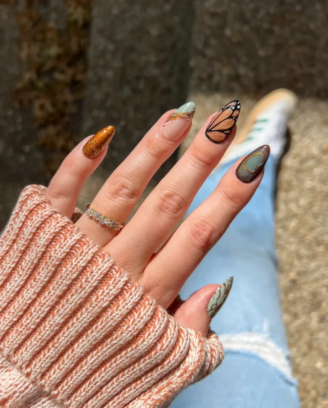 Earthy, artsy, and just a little whimsical—this look combines brown and green abstract shapes with delicate butterfly details.
