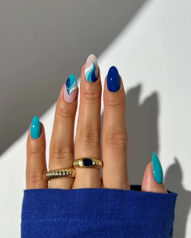 Cool-toned and full of personality, this abstract blue nail design feels like a crisp September breeze.