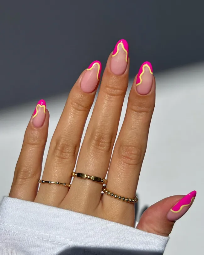 The combination of glossy pink solids, delicate wavy accents, and crisp French tips creates a modern yet feminine look that’s so flattering for early fall.