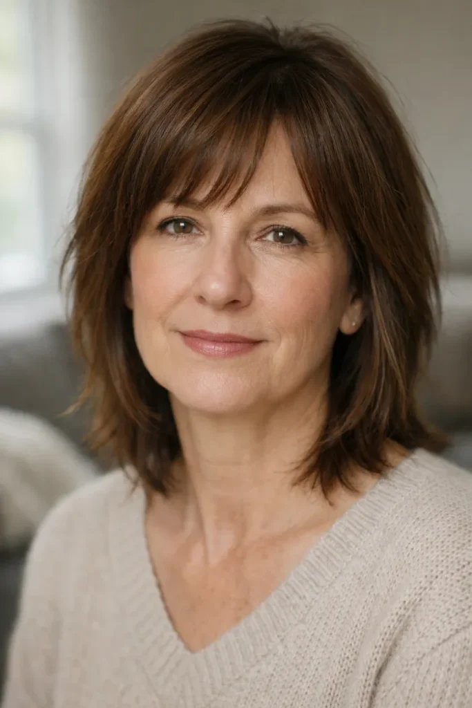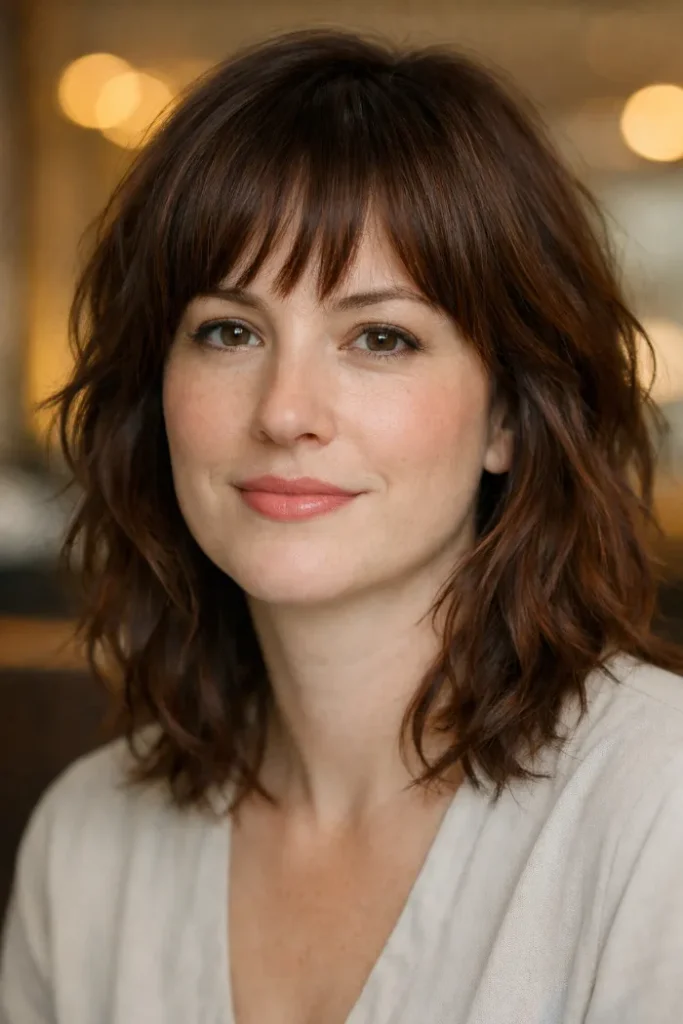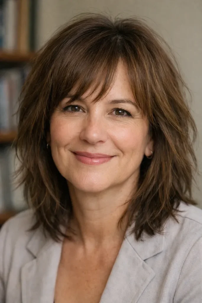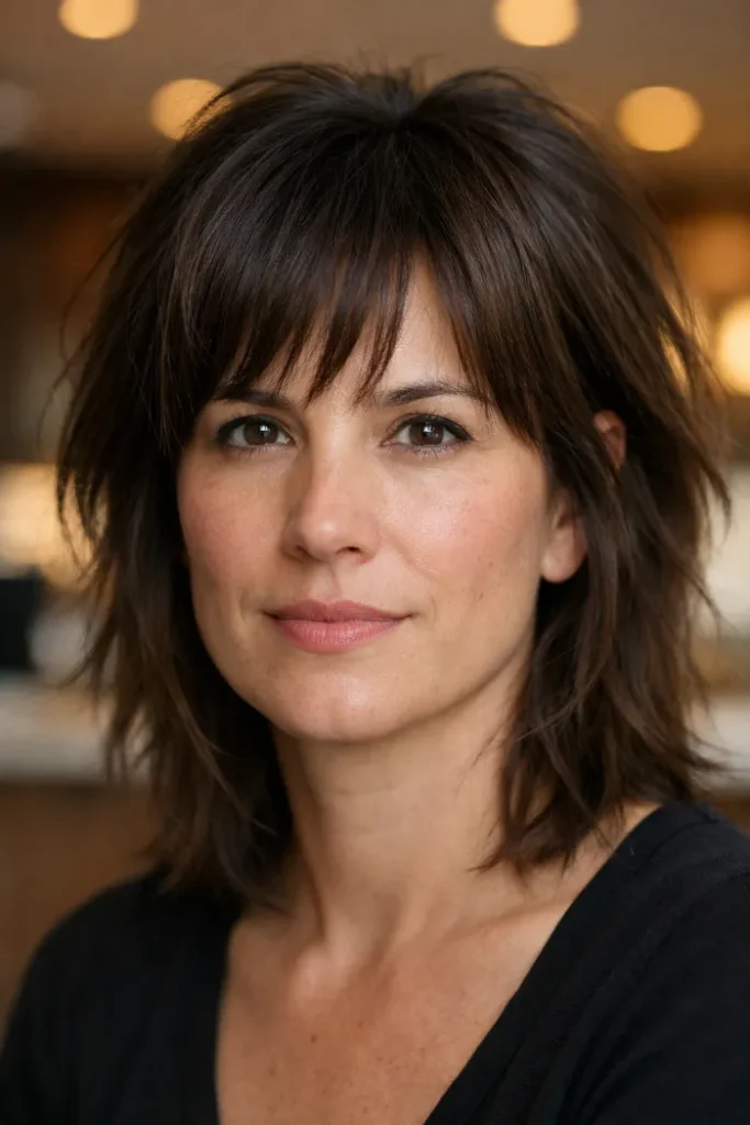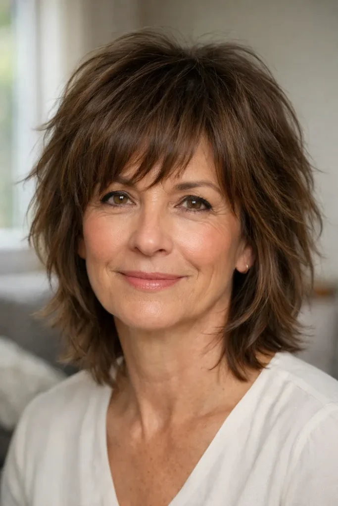 Wispy bangs make this shag feel lighter across the forehead and help the whole cut look softer. The layered shape adds movement through the sides without overdoing it.