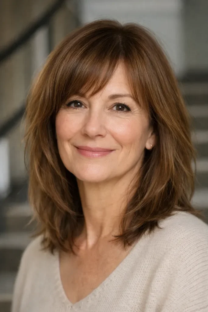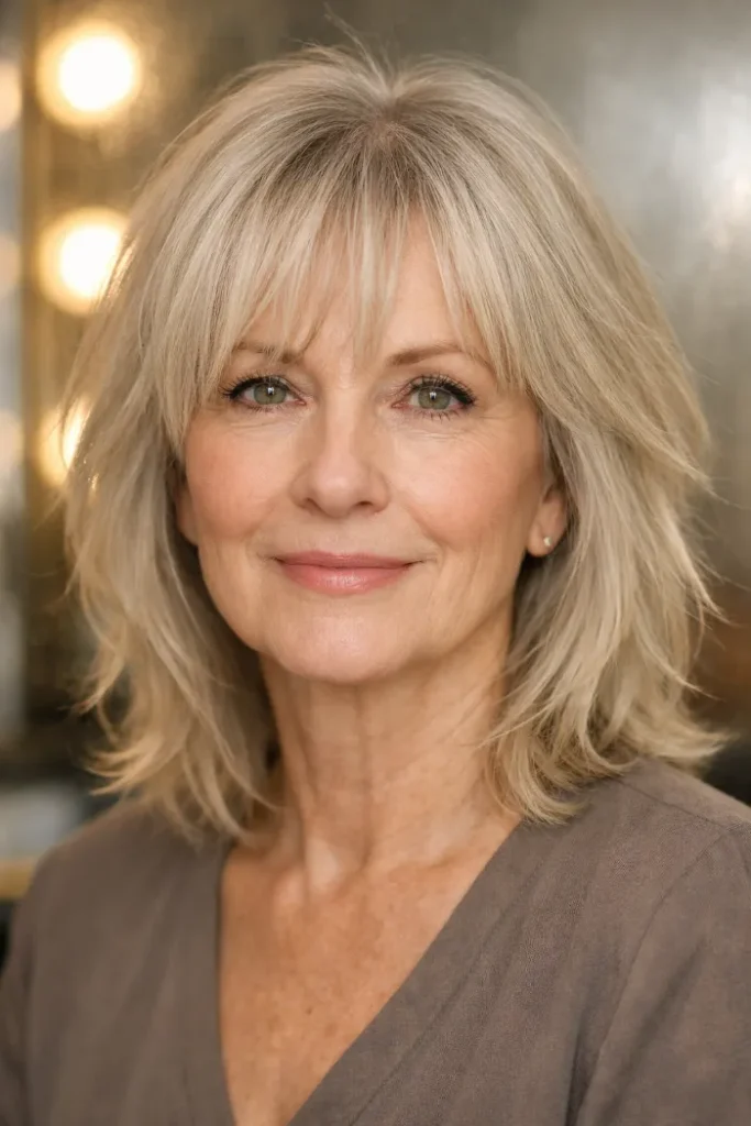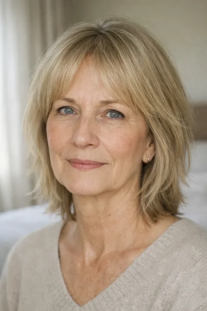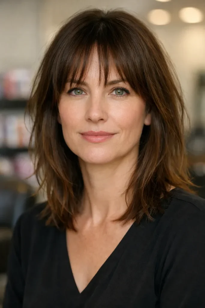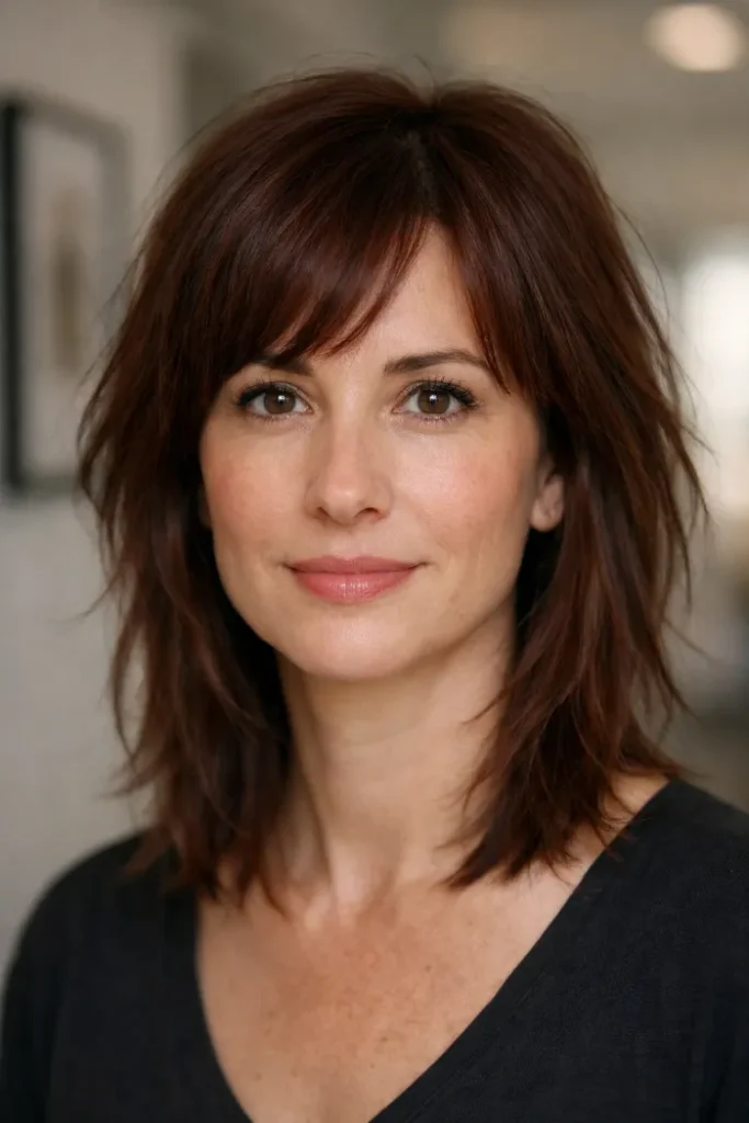 Bottleneck bangs give this medium shag a softer entrance around the forehead, then open up around the cheekbones. That shape adds interest without feeling heavy.