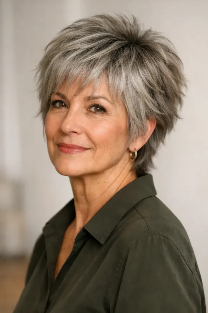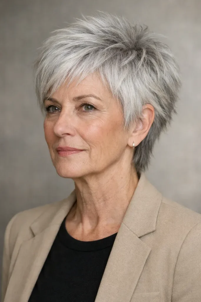 This silver pixie shag has short, textured layering that builds shape through the crown without making the sides bulky. It is especially helpful if you want hair to look fuller on top while keeping the overall cut neat around the ears and neckline.