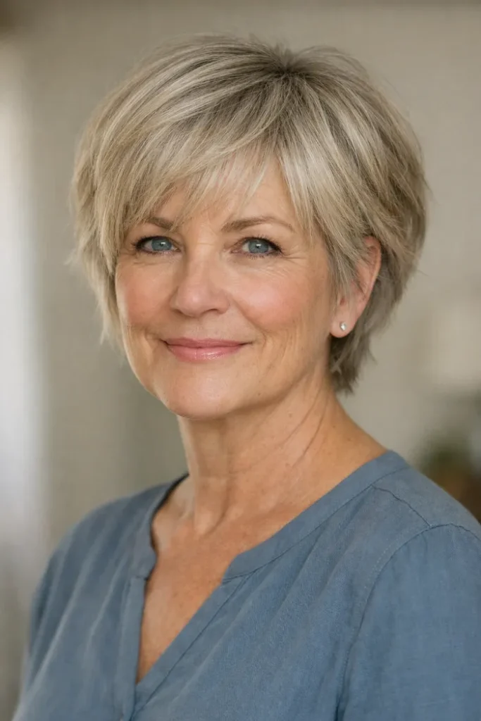 Ask your stylist for a short silver shag with crown lift, soft tapering around the face, and a blended fringe. A lightweight mousse will help keep the top fuller without making it crunchy.