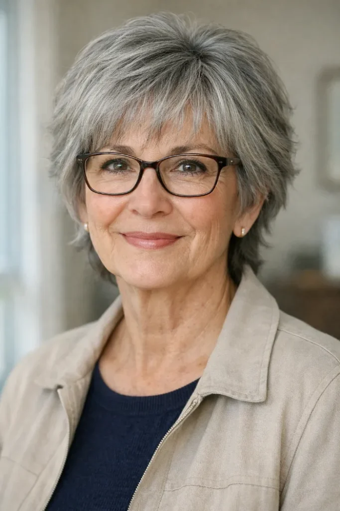This layered gray pixie shag works nicely with glasses because the fringe stays soft and slightly lifted instead of dropping heavily over the frames. The cut keeps volume through the top, which helps the whole shape feel light and open.