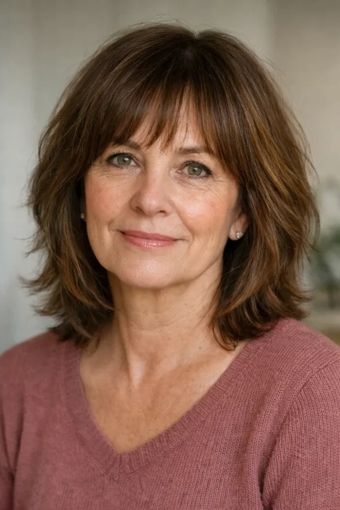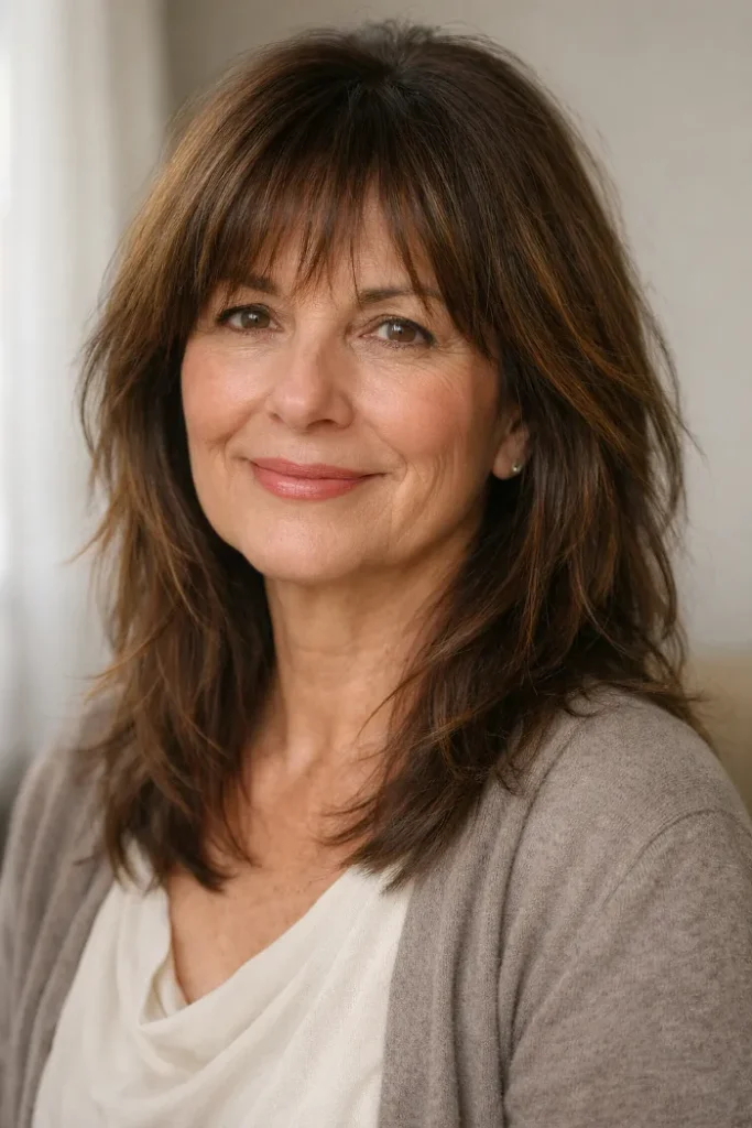 This mid-length shag has gentle layering that keeps the hair moving without making the ends look thin. The airy bangs blend softly into the front, which helps the whole cut feel relaxed and flattering around the eyes and cheekbones.