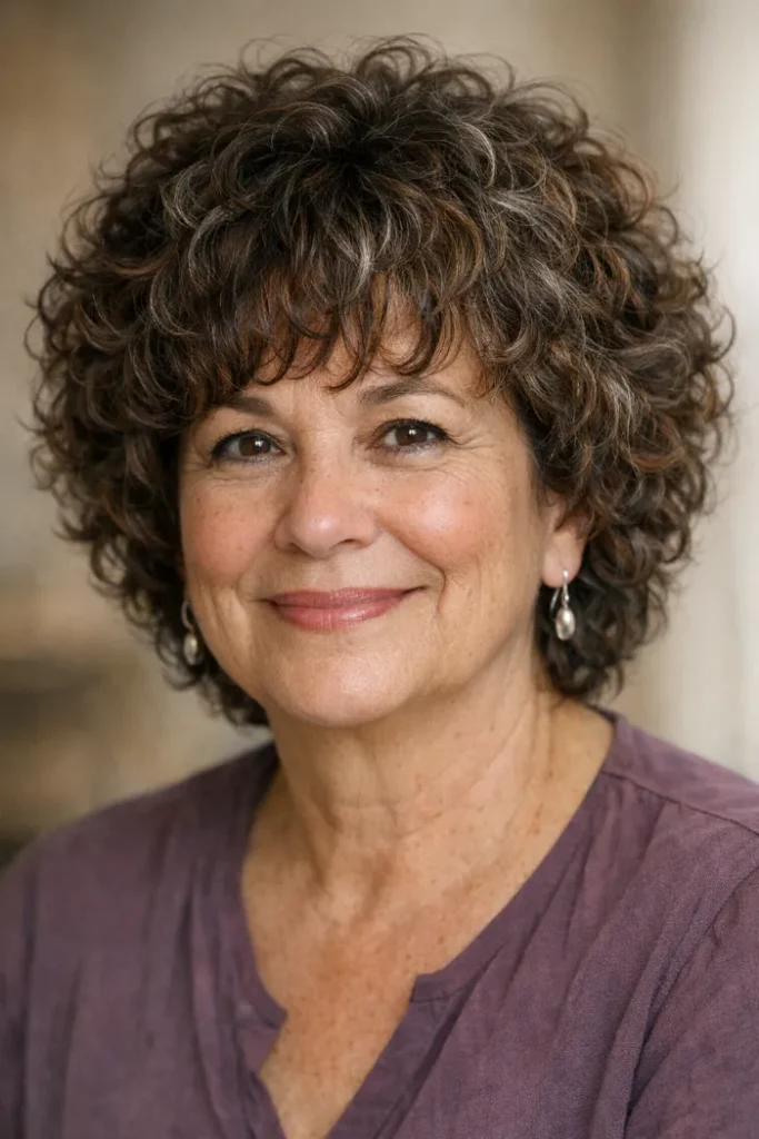This curly shag leans into natural volume, with rounded layering that keeps the shape full but controlled. The curly fringe softens the forehead, and the shorter interior layers help the curls lift instead of dropping into one heavy block.