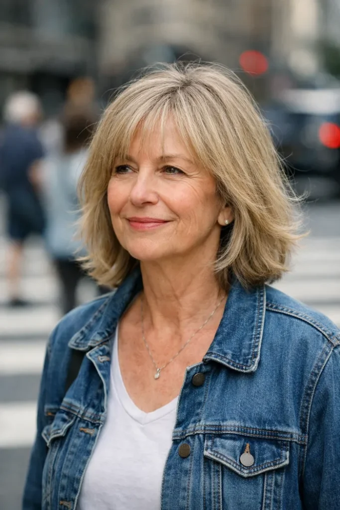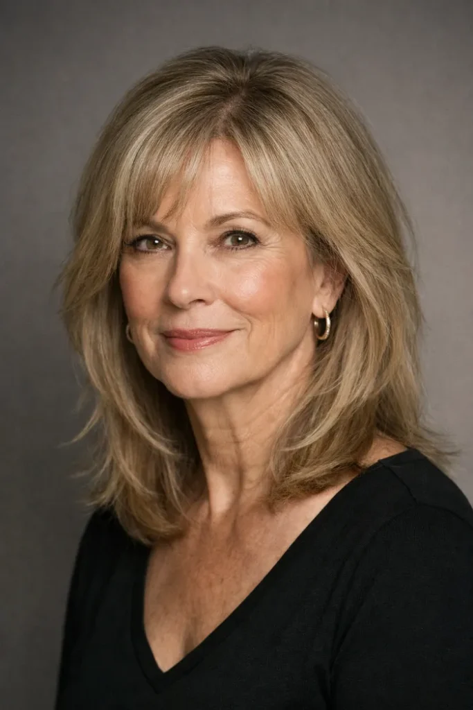 Feathered layers plus a blowout give you that airy, swingy movement that looks polished without feeling stiff. The ends flip softly away from the face, which is super flattering after 50. A round brush and light mousse are enough.
