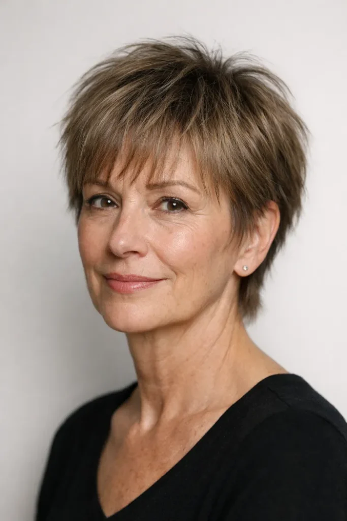 This pixie shag keeps the crown full and the edges light, so it never looks flat or severe. The wispy fringe softens the forehead and blends into the texture. Use a tiny bit of styling cream to keep the layers airy, not spiky.