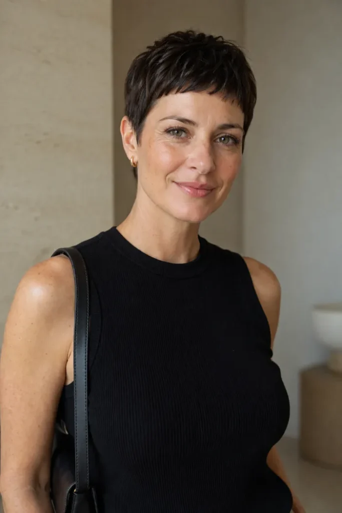 This soft brunette micro pixie keeps the outline close and neat without feeling severe. The light texture on top gives it movement, while the short fringe opens the face beautifully. It is an easy choice if you want something polished, modern, and low effort.