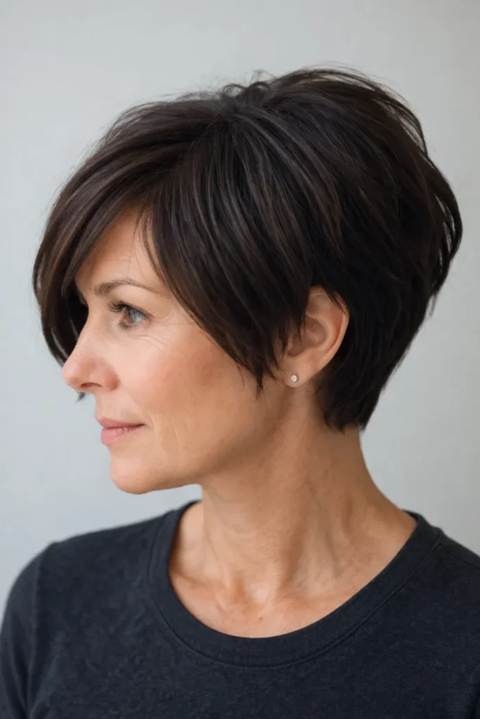 This stacked pixie bob has a fuller back, a smooth crown, and a long side fringe that frames the face gently. It gives short hair some shape without looking stiff. The deep brunette tone also helps the layers look richer and more defined.