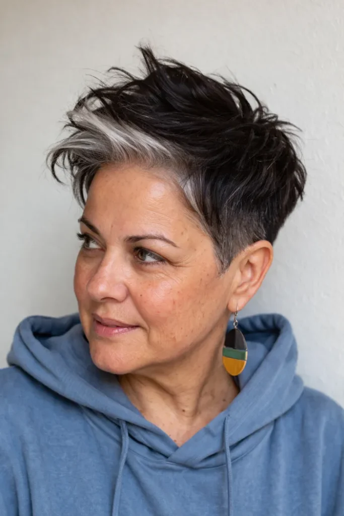 This dark pixie stands out with its short tapered sides and bold silver streak at the front. The lifted top adds height, while the contrast gives the whole cut more personality. It feels confident, expressive, and still very wearable for everyday styling.