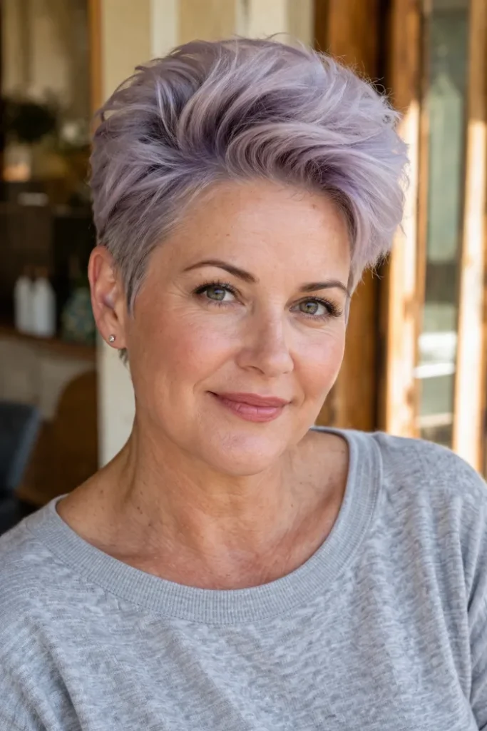 This lavender frost pixie brings softness and height together in a really flattering way. The sides stay close, but the full top keeps the shape airy and bright. It is a fun color choice that still feels elegant because the cut itself stays clean.