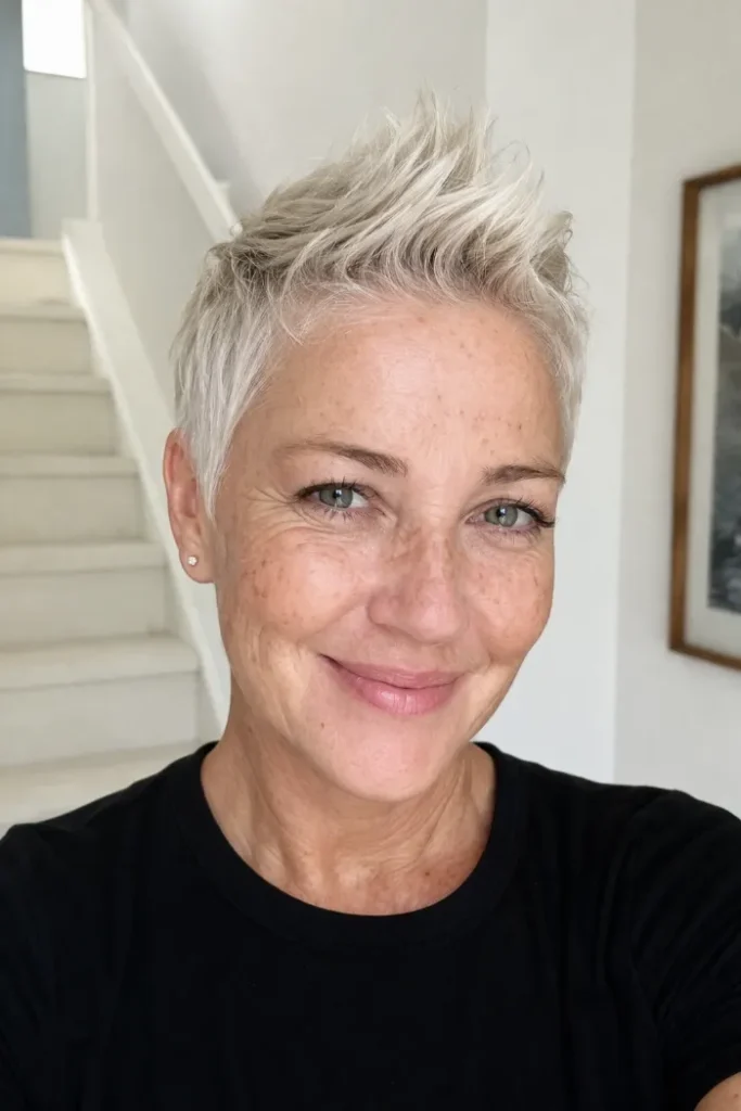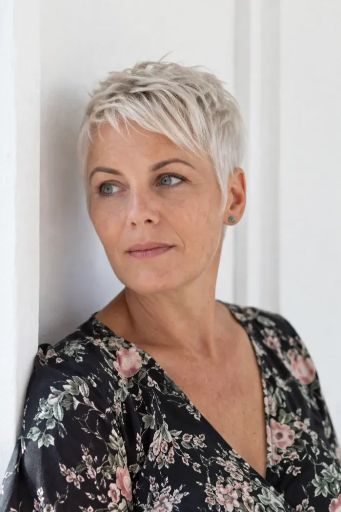 Ask for a pixie with closely cut sides and longer layers on top for soft volume. A tinted mousse or color-safe texture cream can help keep the pale tone lively while supporting the shape.