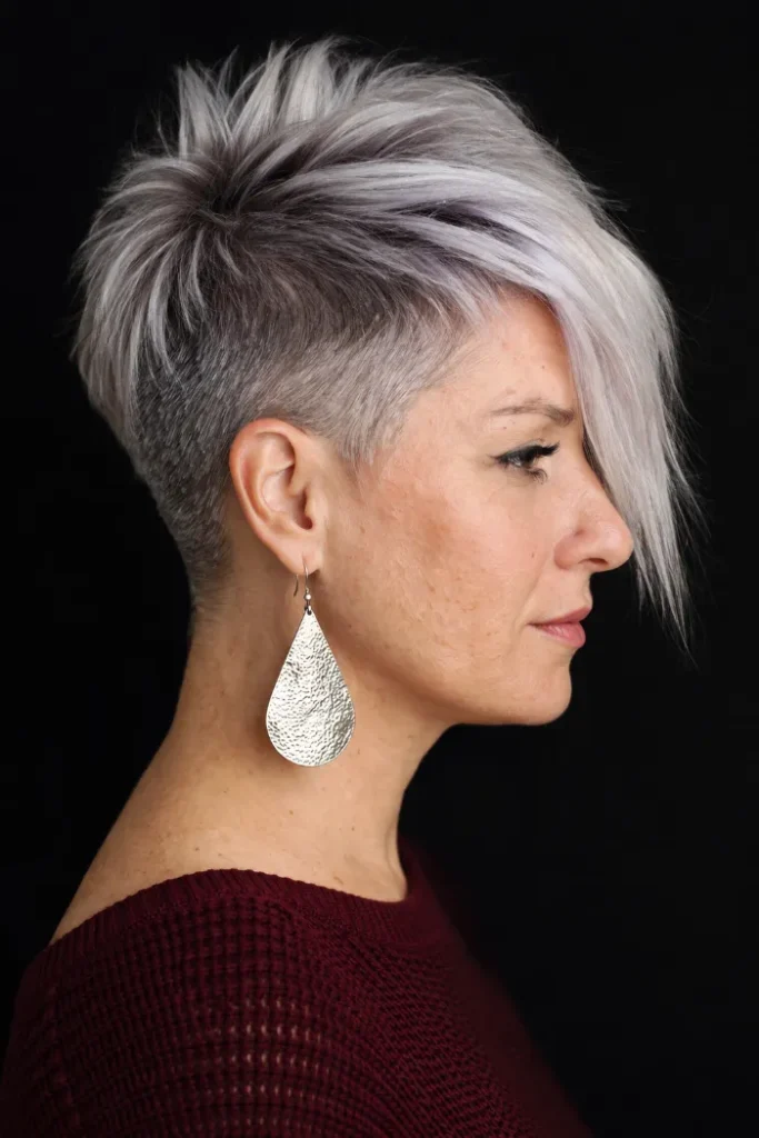 This platinum undercut pixie mixes a close cropped side with a long sweeping top for strong contrast. The shape gives drama, but the soft silver tone keeps it from feeling too harsh. It is a striking option if you like a more fashion-forward short cut.