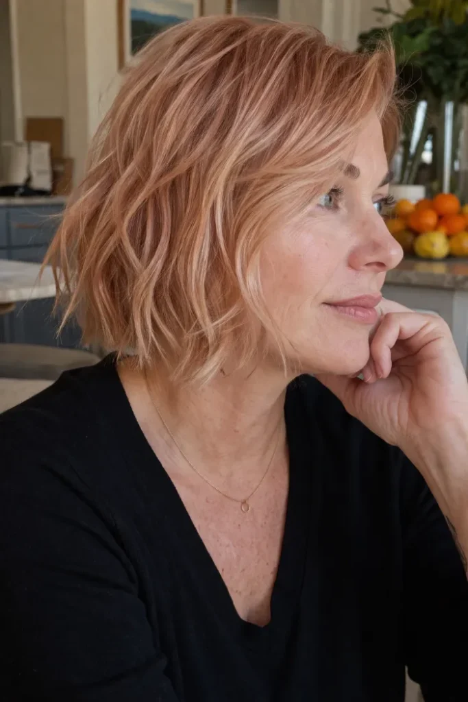 This rose gold bob has soft waves and broken layers that give it a relaxed, airy shape. The length sits right around the jaw, which keeps it flattering and easy to wear. The warm color also adds dimension without making the style look too busy.