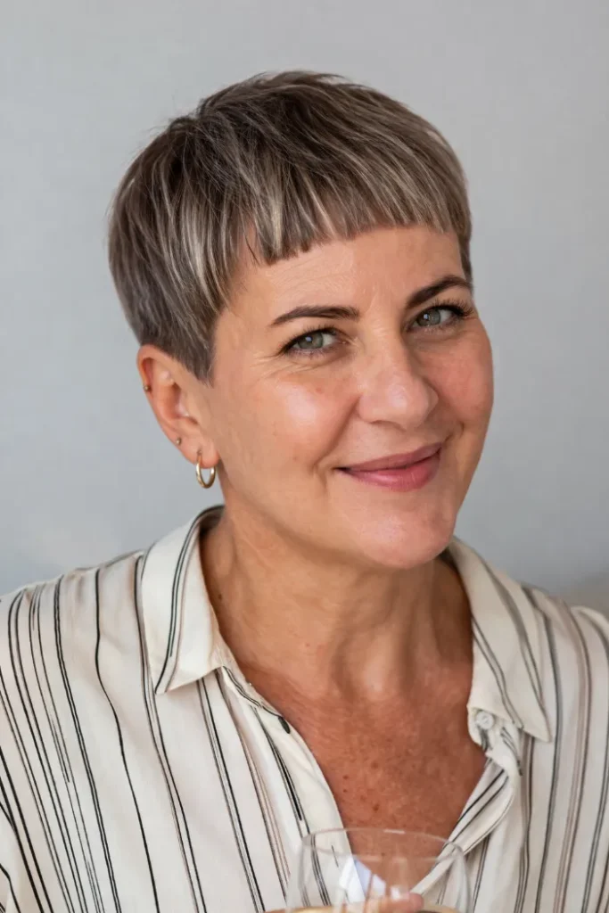 This tapered crop keeps the sides and back close, while the blunt micro fringe gives it a sharp finished edge. The rounded shape through the crown softens the look nicely. It is neat, modern, and especially good if you like short hair with structure.