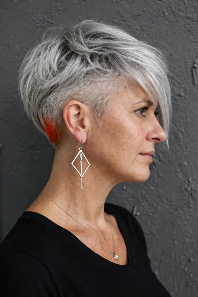 This silver pixie bob pairs an undercut back with a long sweeping fringe that falls across the face. That contrast gives the style shape and movement without needing extra bulk. The icy tone makes it feel bold, but the cut still looks balanced.