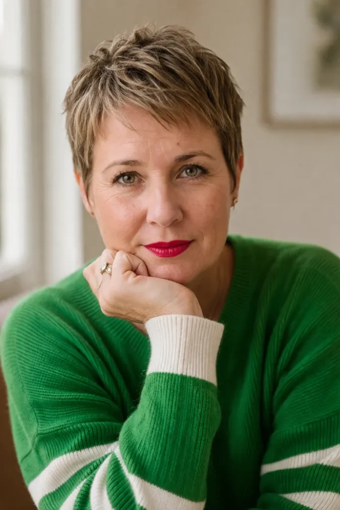 Ask for a very short pixie with soft texture through the crown and a short, natural fringe. Use a light styling cream to keep the shape neat without making it look stiff.