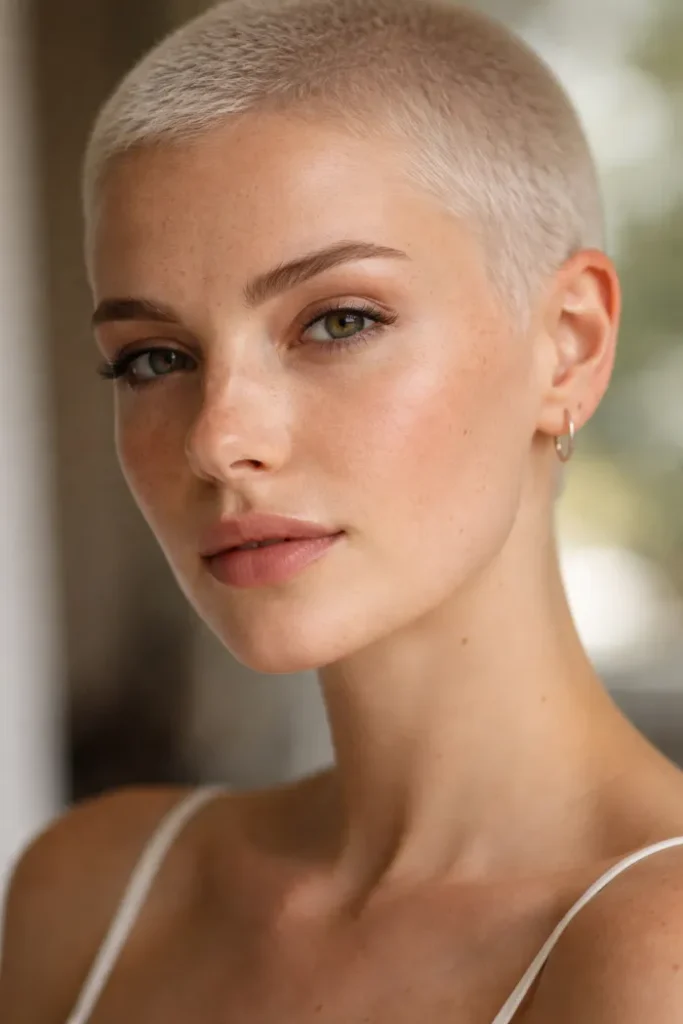A blonde buzz cut is bold, clean, and surprisingly flattering on fine hair because there is no weight dragging it down. The even length highlights your bone structure and brows. Keep it soft with a hydrating scalp oil and a purple shampoo if needed.