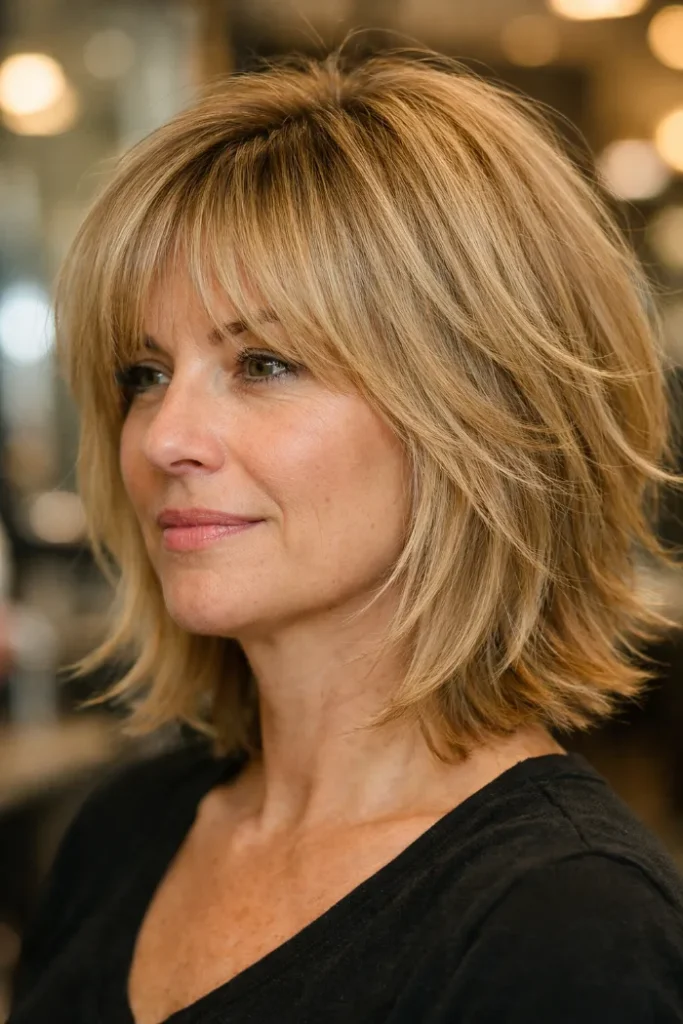 Windswept layers are perfect when you want volume without a stiff, set look. The feathered texture lifts the crown and softens the ends, so thin hair looks airy but not wispy. Blow dry forward first, then sweep it back with a round brush for lift.