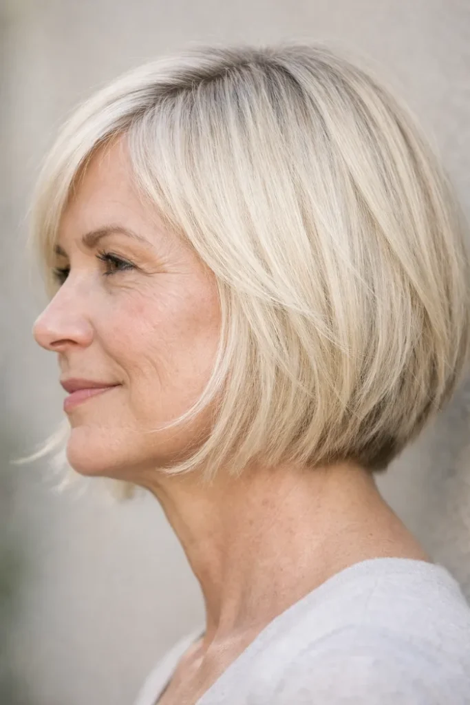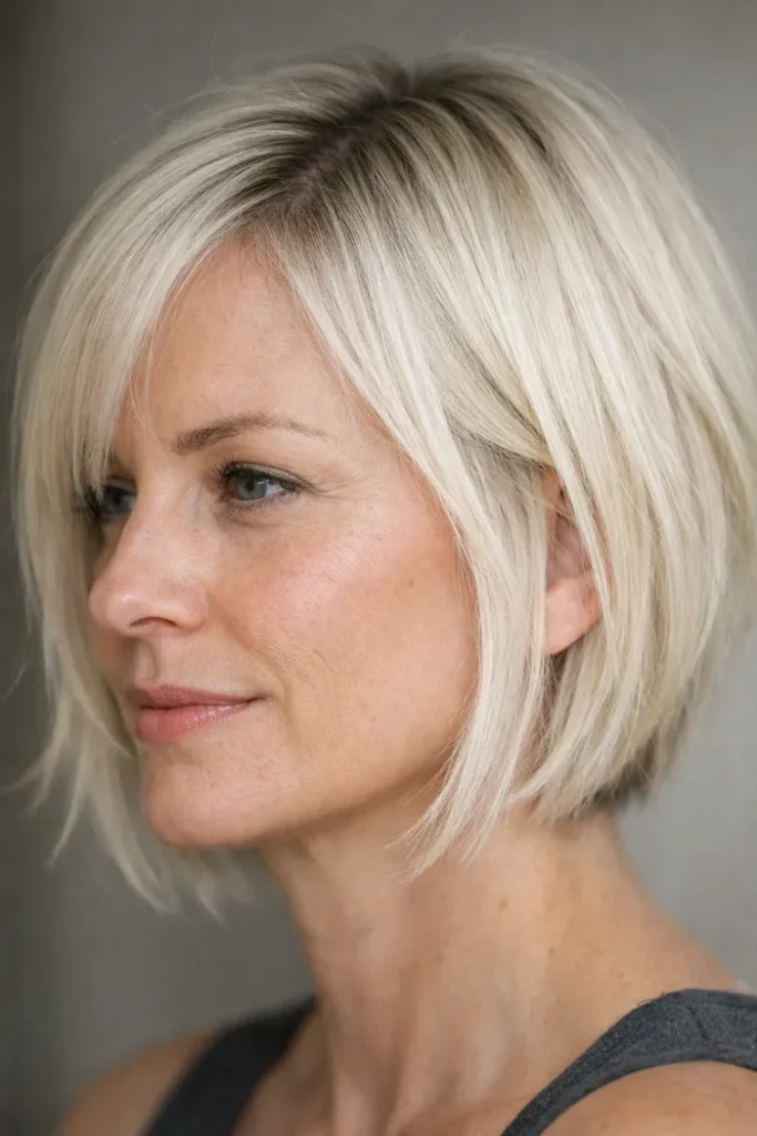 This platinum layered bob gives thin hair a little lift without looking choppy. The layers are soft and airy, so the ends still feel full. It works best with a side part and a quick blow dry. Add root spray, then smooth the top lightly.