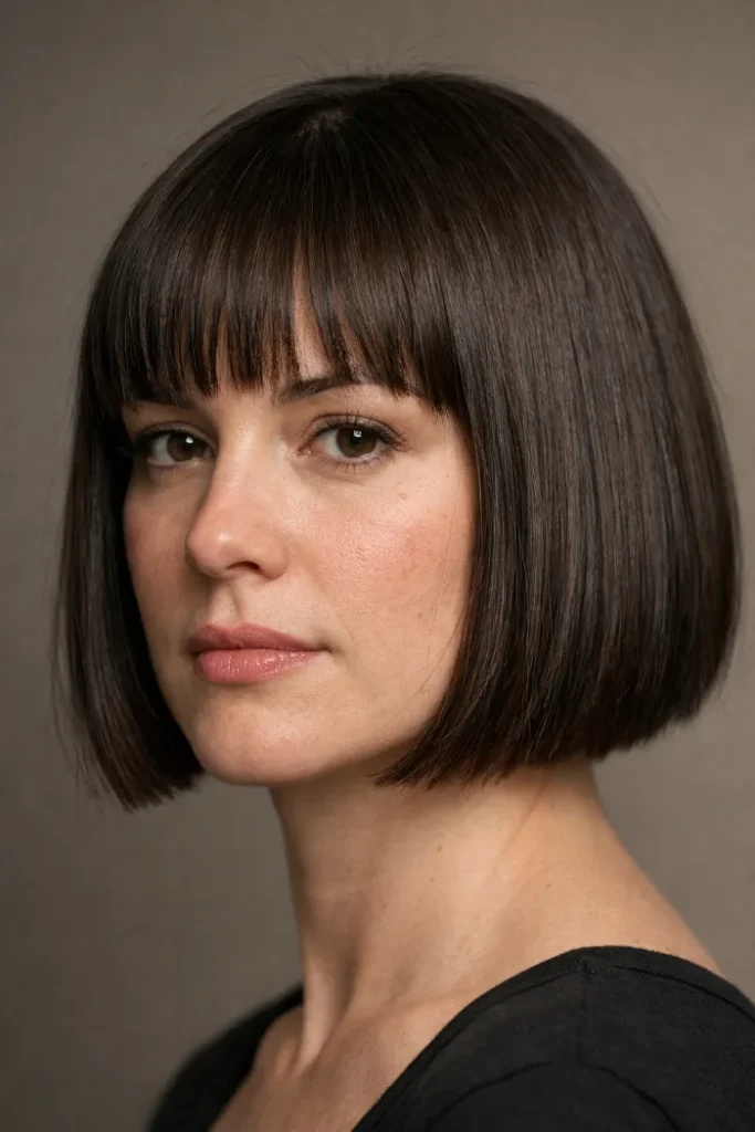 A classic bob with blunt bangs is a smart move when your strands are fine. The straight fringe creates density across the front, while the clean ends make the whole cut look thicker. Keep the bangs trimmed and use dry shampoo for grip.