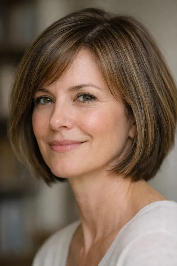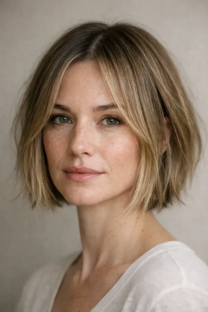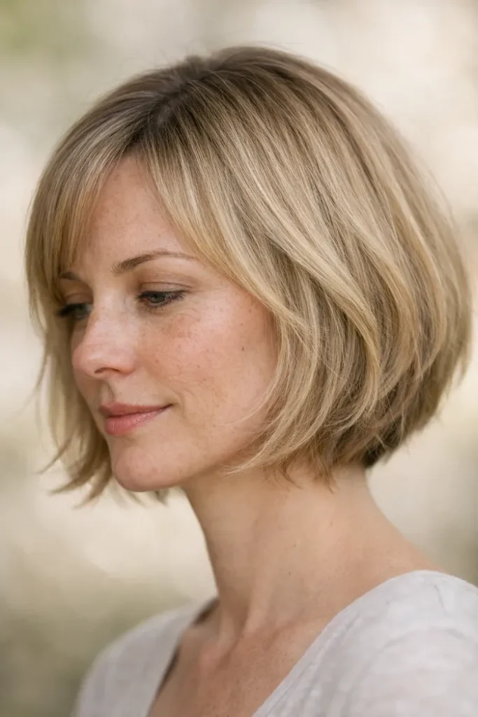 This classic bob with soft layers keeps movement without turning wispy. The layers sit mostly on the surface, so the ends still look full. It is great if you like a natural blowout. Try a volumizing spray at the roots before drying.