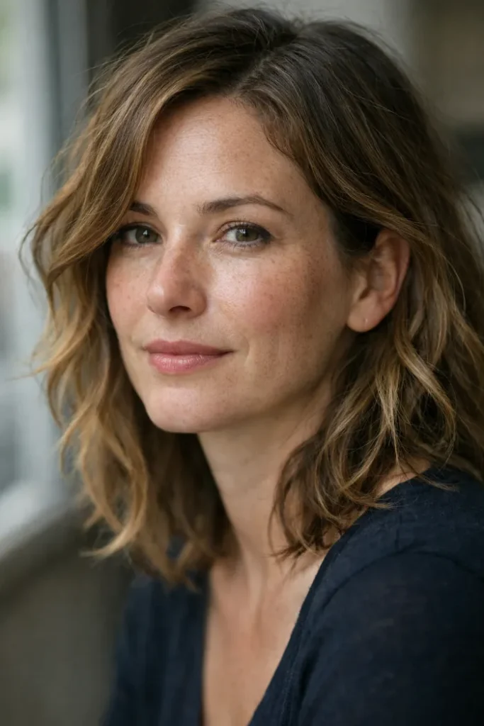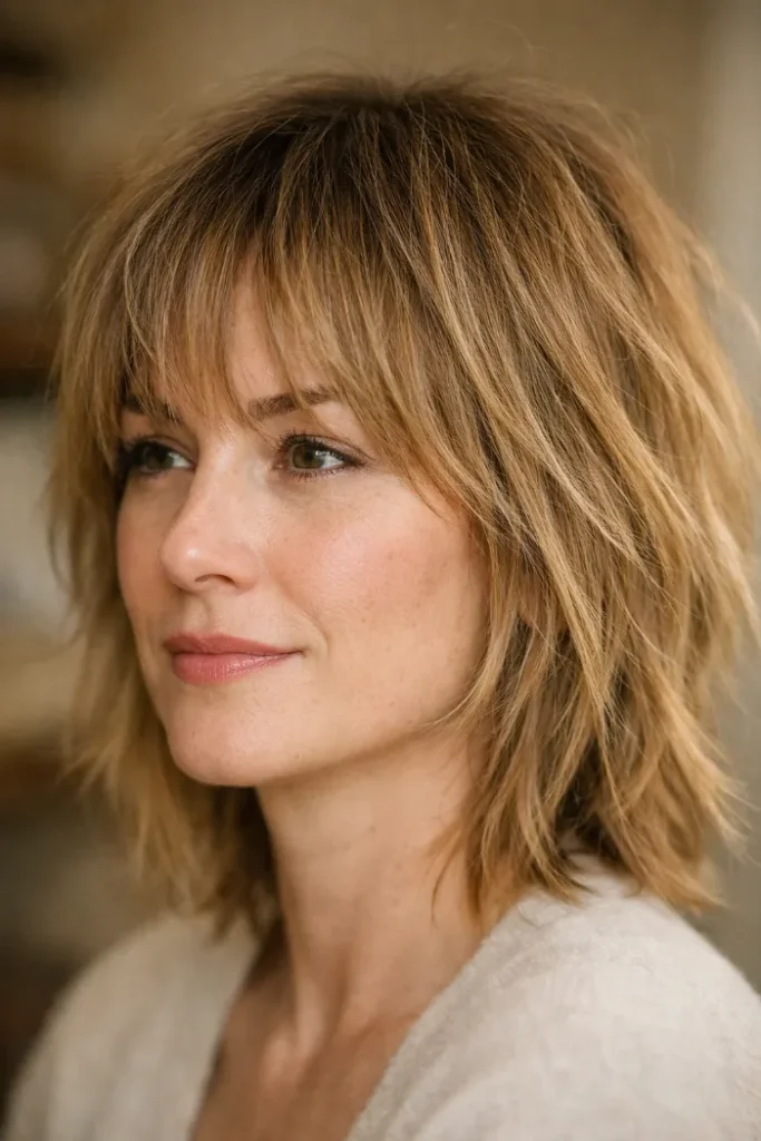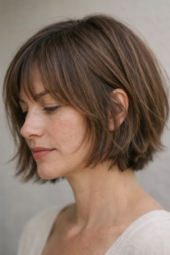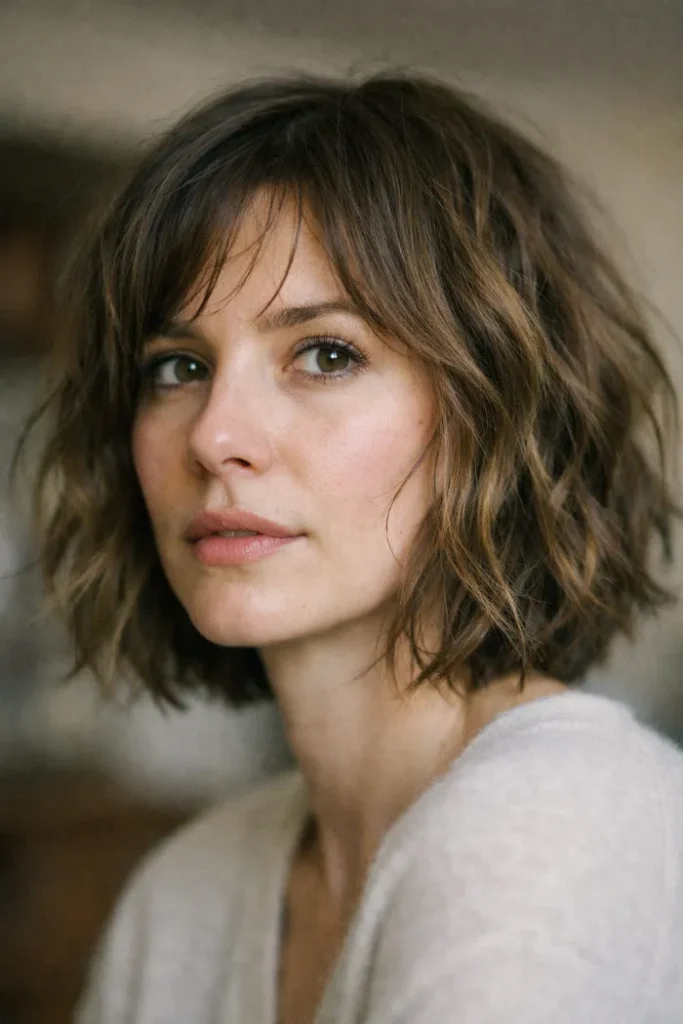 A tousled bob with soft bangs is great when you want coverage at the forehead and volume through the sides. The bangs are light, so they do not feel heavy or boxy. Blow dry the fringe forward first, then add loose texture through the rest with spray.