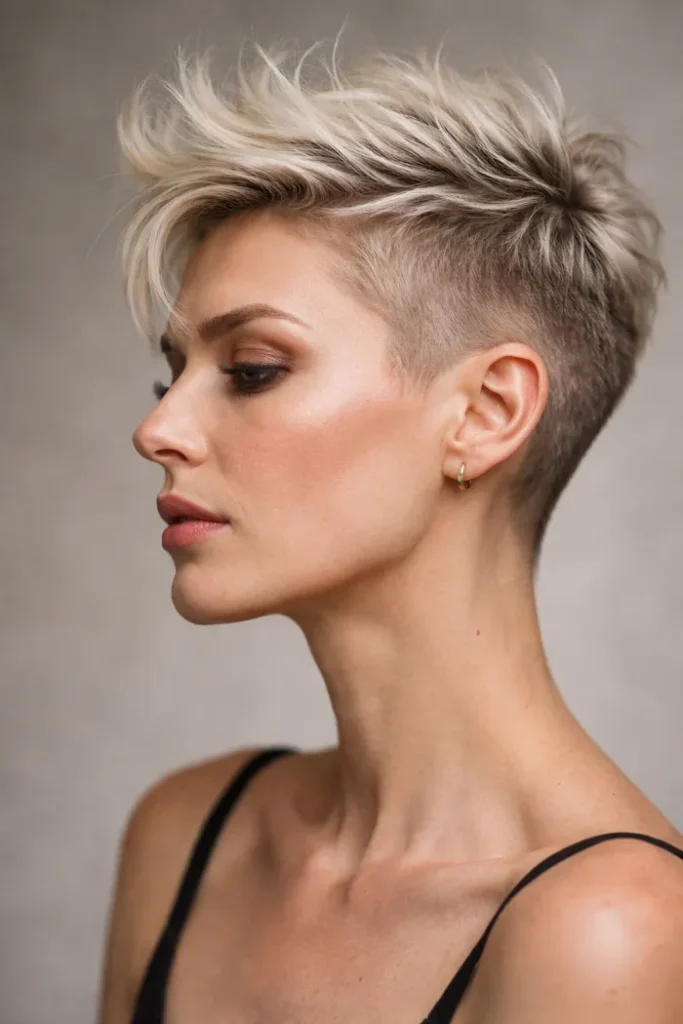 This platinum mohawk pixie is all about height through the center, with clean sides that keep it sharp. Thin hair benefits from that raised top because it creates the illusion of density. Work in a matte styling powder, then pinch the front upward for shape.