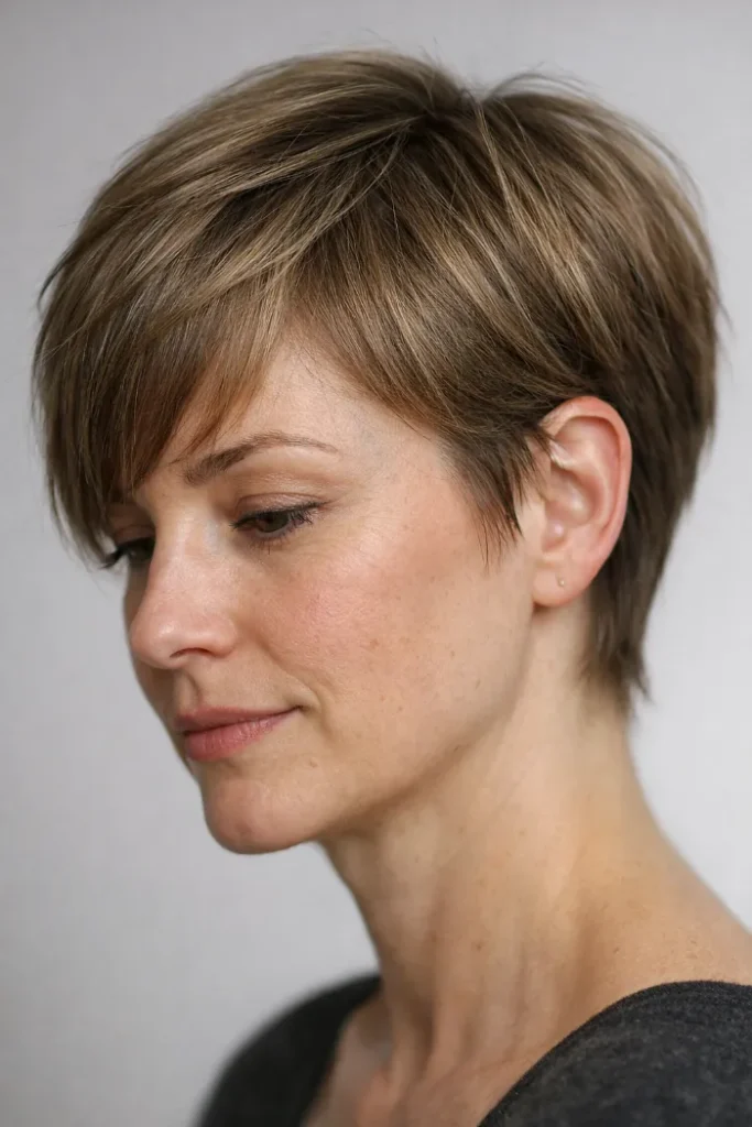 Side swept pixie layers are great when you want coverage and volume in one move. The longer top glides across the forehead and makes thin spots less noticeable. Ask your stylist for a tapered nape and a soft fringe. Finish with mousse and finger style.