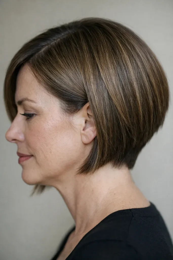 A sleek angled bob makes fine hair look thicker because the front pieces sit longer and heavier, while the back stays clean and stacked. It frames the face beautifully and always looks intentional. Use a heat protectant, flat iron the ends slightly, and add shine spray.