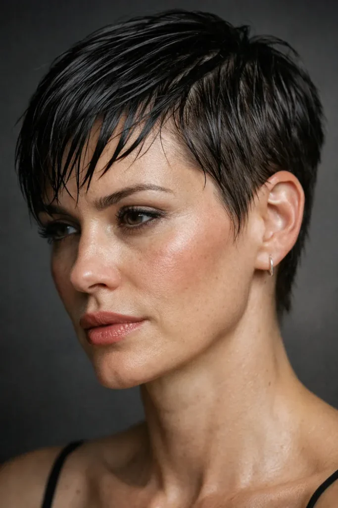 A wet look pixie is a fun way to make short thin hair look sleek and intentional. The shine and direction make the style feel fuller, especially around the fringe. Use a lightweight gel, comb it forward or to the side, then tap in gloss for finish.