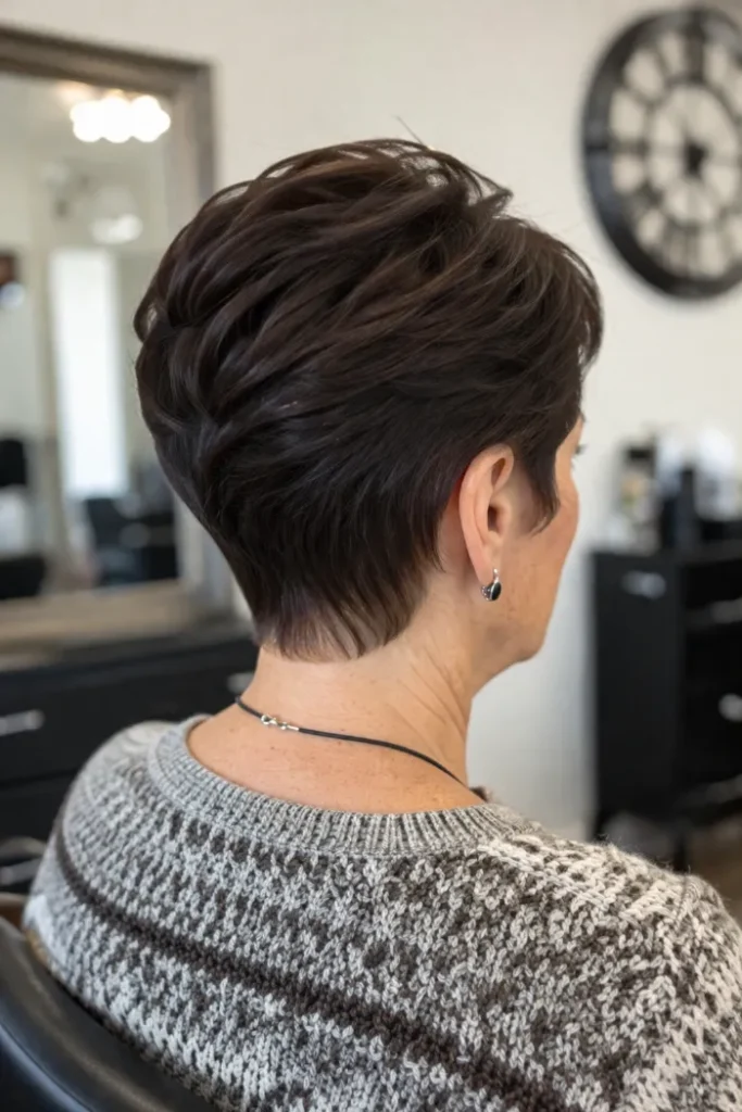 Ask for a layered pixie with a softly tapered nape and rounded buildup through the crown. Ask them to keep the back smooth and blended, not stacked too hard.