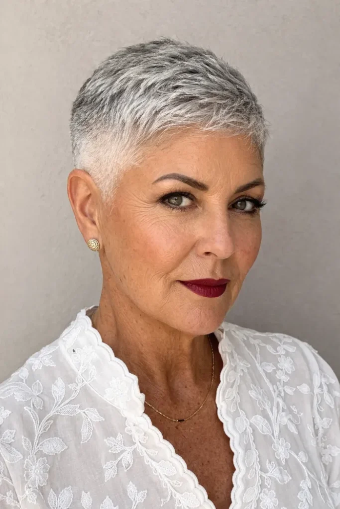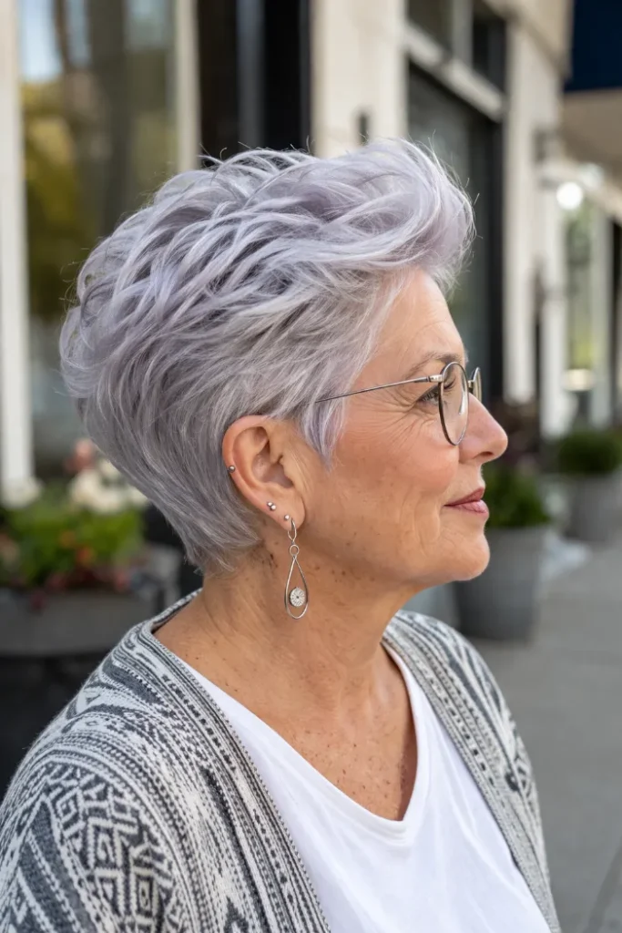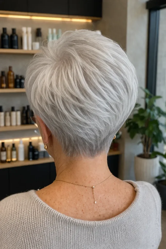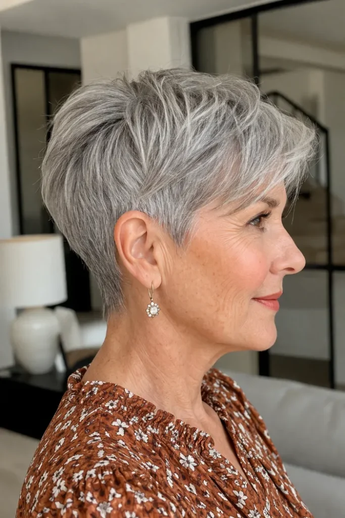 This gray pixie uses feathered layers to create softness through the top and front. The shape has a little lift at the crown, but it still lies close enough to feel neat, light, and easy to manage day to day.