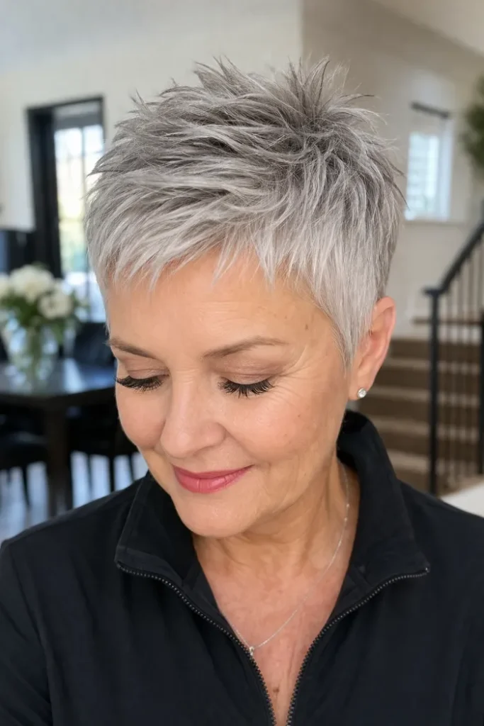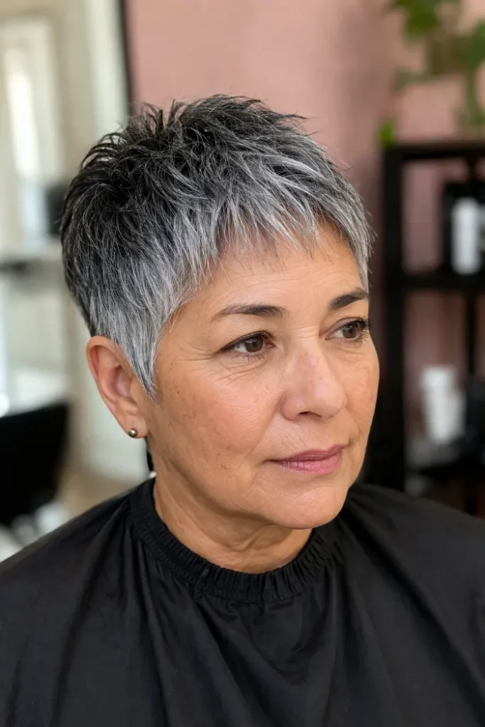 This salt and pepper pixie crop has short texture through the top that gives it lift without making it look stiff. The close sides keep the shape neat, while the mixed tones add depth and make the cut feel more dimensional.