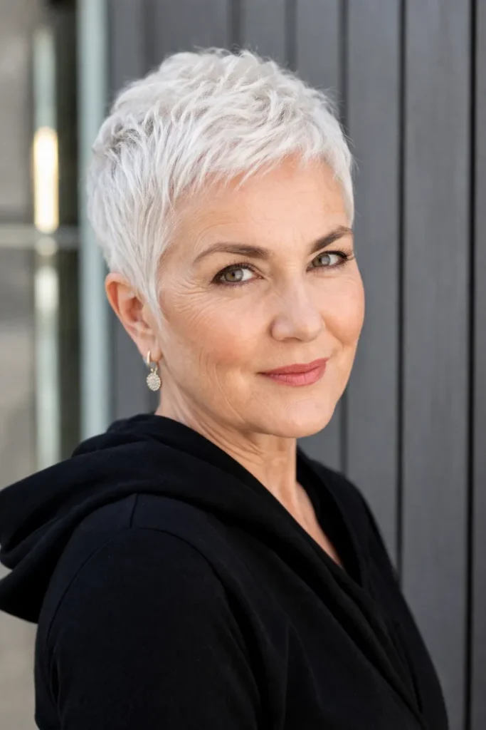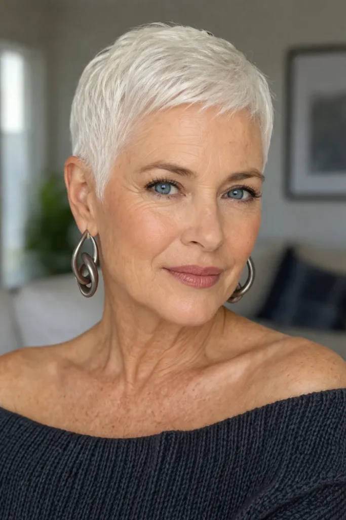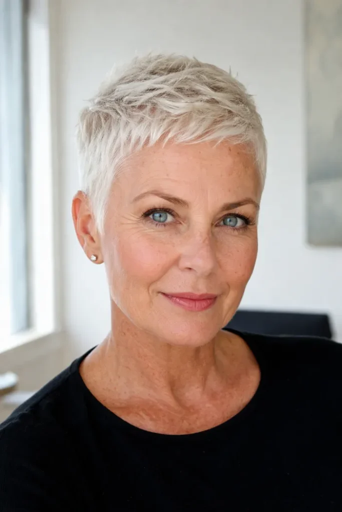 Ask for a very short white pixie with fine choppy texture on top and a soft close taper at the sides. A touch of styling cream will keep it neat with light separation.