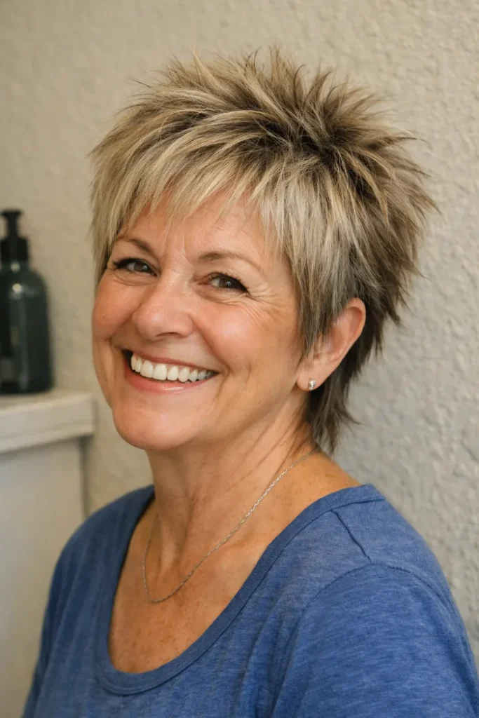 This blonde pixie shag leans more textured and lifted, especially at the crown. The shorter sides keep it tidy, while the spiky top gives it energy. It is good for someone who wants a lively shape that still feels light and easy around the face.