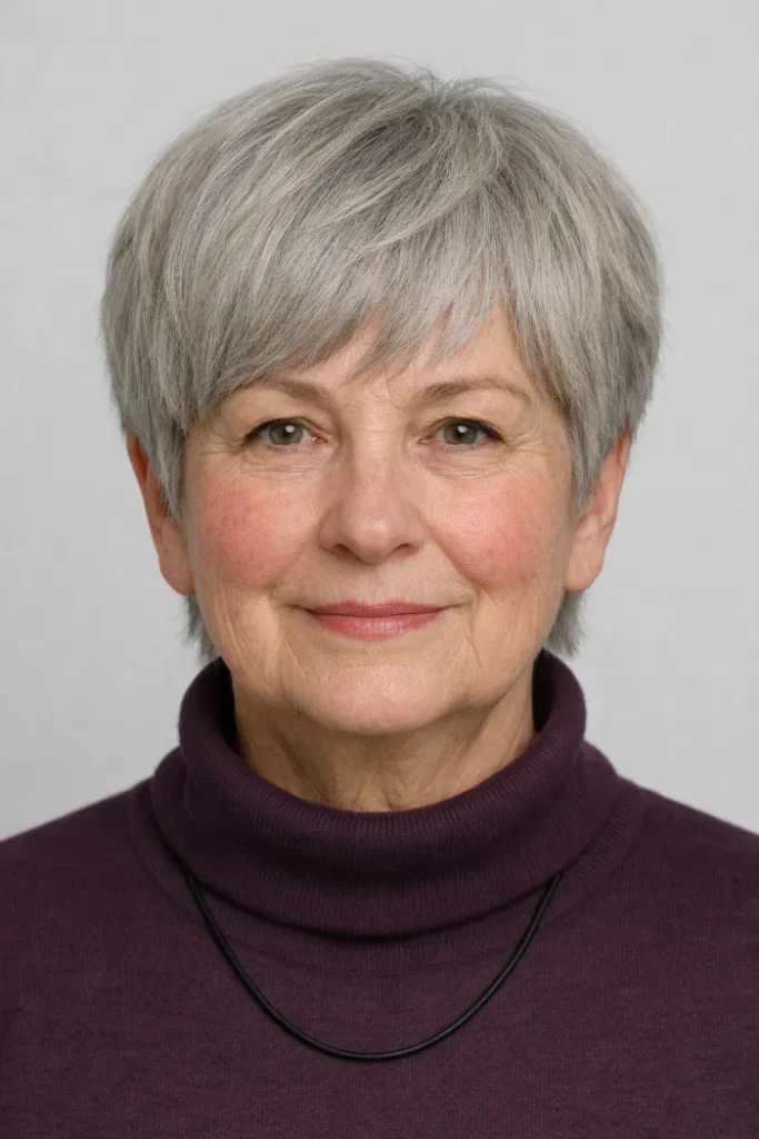 This silver shag pixie has soft fullness on top and a more piecey finish through the back, which gives it a slightly undone feel. The side profile stays flattering because the fringe is gentle and the crown does not sit too high.