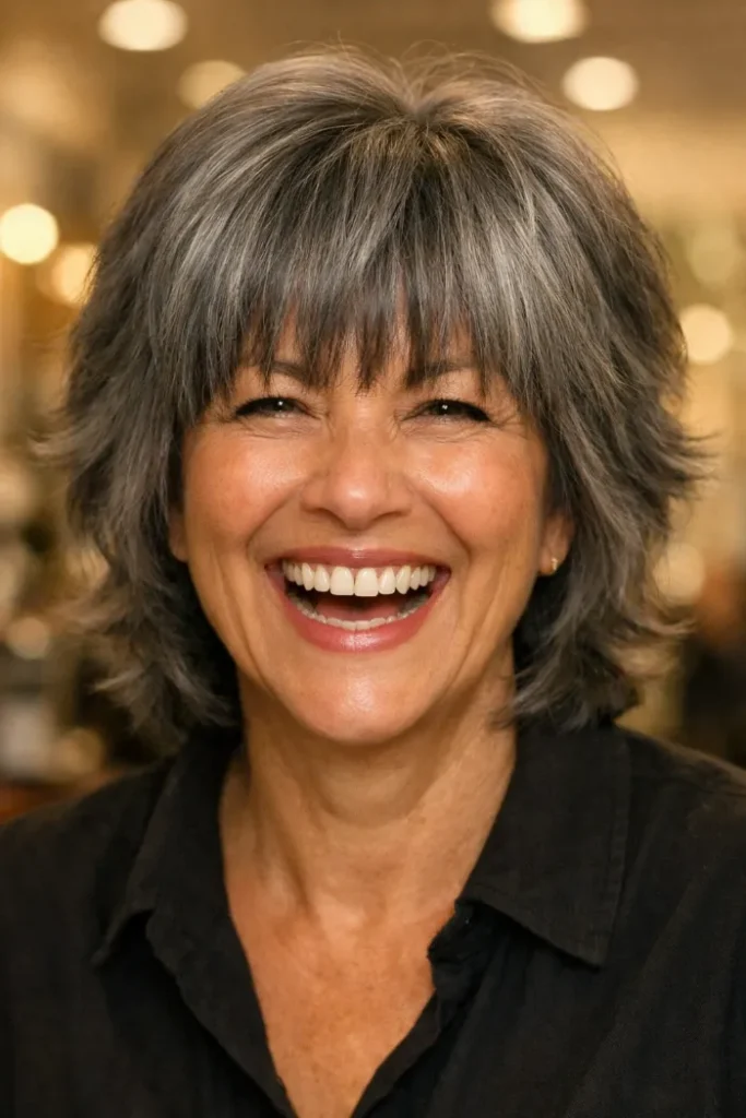 This gray shag has more fullness through the fringe and sides, which gives it a lively shape without making it look wide. The layers flick out softly around the neck, helping the cut feel light and a little playful while still staying easy to wear.