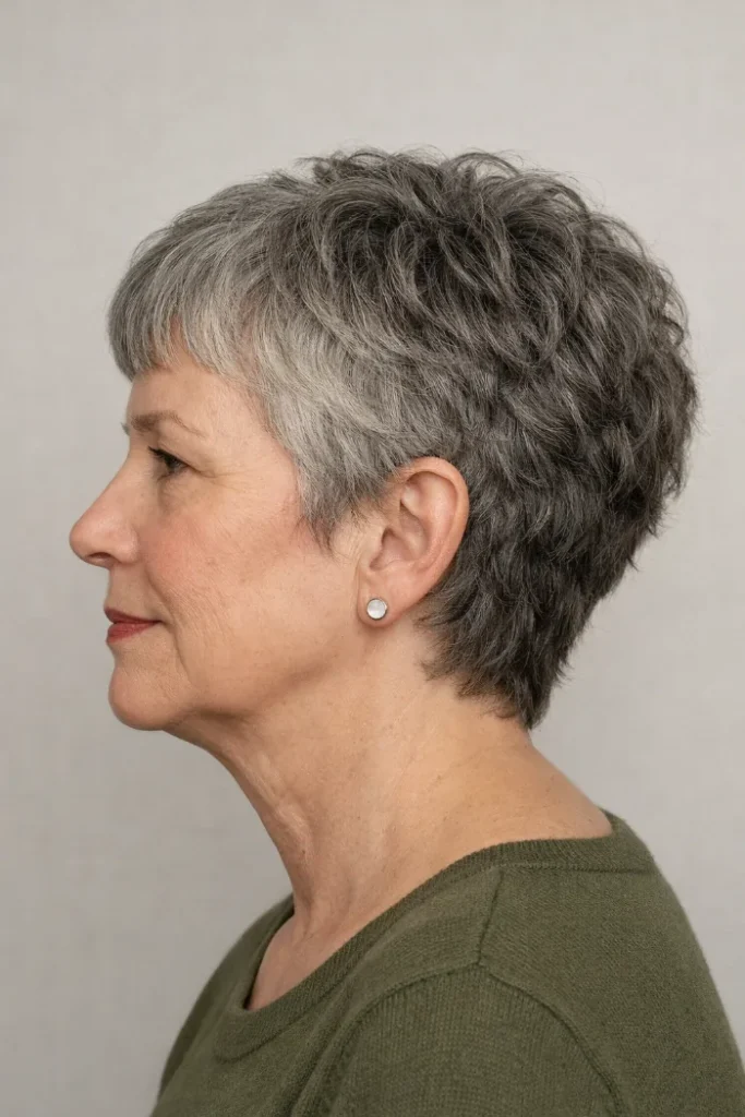 This cropped silver shag keeps the sides and nape close, then builds soft texture through the crown. The short fringe helps it feel neat from the front, while the layering in back stops the shape from looking flat or overly rounded.