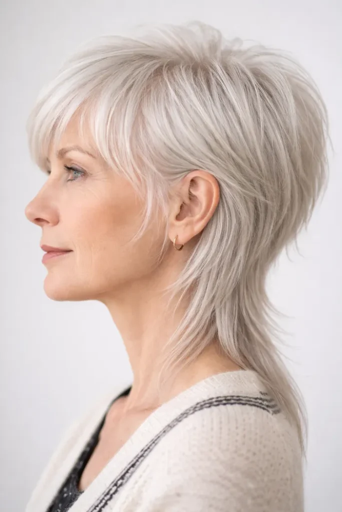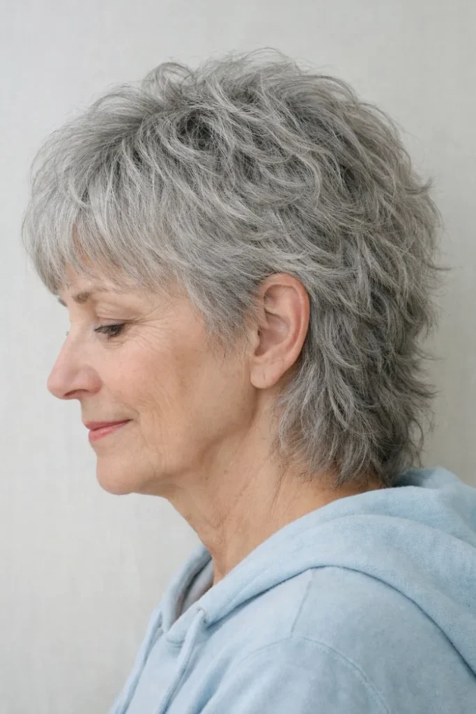 This gray cut leans toward a soft shag mullet, but the light curl and airy layering keep it from feeling too sharp. The shape stays fuller around the crown, then tapers into a softer back. It works well if you want movement without harsh edges.