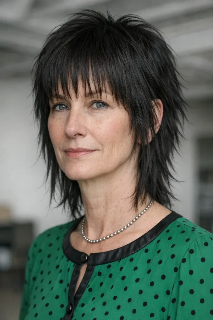 This darker shag has a more dramatic outline because the layers stay narrow and piecey through the sides and back. The long wispy fringe softens it a little, but it still reads bold. It suits someone who likes texture with a sharper finish.