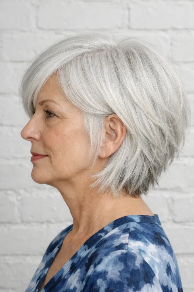 This silver cut sits between a bob and a shag, with a smoother outline through the back and soft lift through the crown. It looks tidy from the side but still has texture at the ends. That balance makes it polished without feeling stiff.