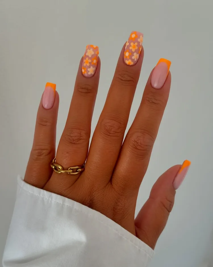 These short nails mix playful orange tips with cheerful floral accents, making them the ultimate summer statement. The design feels light and fun while still looking polished and trendy. Perfect for beach days, picnics, or any sunny outing where you want your nails to stand out.