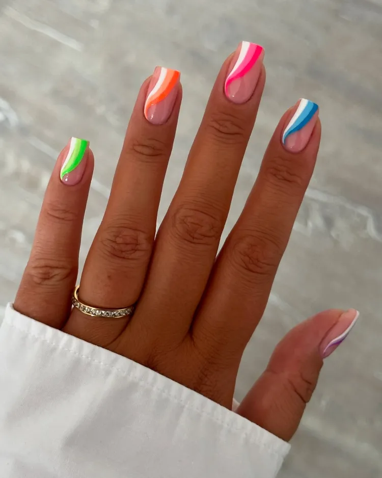 Colorful swirls in neon green, orange, pink, and blue give these short nails a playful and trendy vibe. The clear base keeps the look fresh and airy, perfect for hot summer days. This design is fun, eye-catching, and guaranteed to spark compliments everywhere you go.