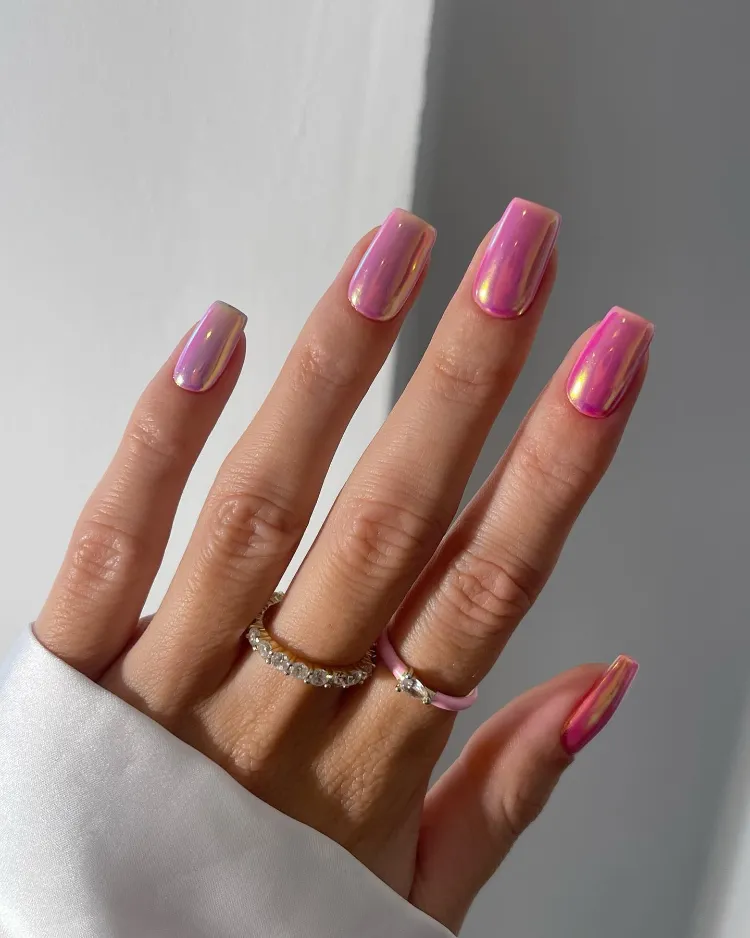 If you love a little sparkle, pink chrome nails are a must. The reflective finish gives these short nails a futuristic glow, catching the light beautifully. They’re versatile enough to wear every day but glam enough for summer events, making them a chic and trendy choice.