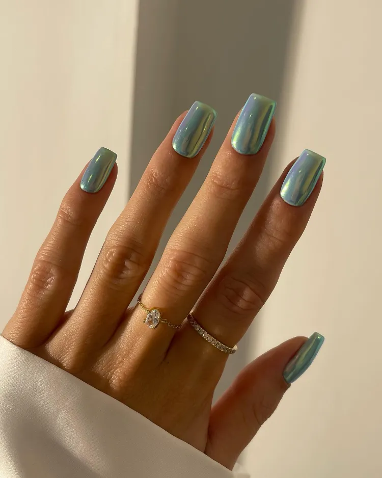 Shimmering with a sunset glow, these chrome nails blend coral, gold, and soft orange into a radiant finish. The metallic shift catches the light beautifully, making them feel luxurious and vibrant. They’re the ultimate “vacation ready” mani that screams warmth, fun, and effortless glam.